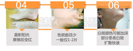 不痛不痒,不红肿,白斑光滑。白斑在阳光下暴晒会有反应,具有一定的隐蔽性。