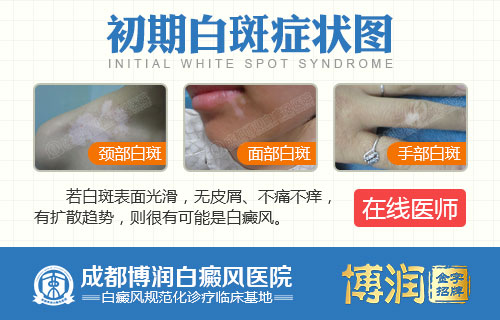 白斑种类较多,可能是晕痣、花斑癣、贫血痣等,但是一般白癜风的几率较大。患者可参照以下初期症状,初步自我检测: