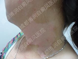 ▲病 史:患者1年前发现颈部一片状白斑,在其他医院就诊,口服药加外用药,用药2月后白斑区逐渐扩大,随之腹部也出现白斑。为求近一步治疗,今来我院求诊。