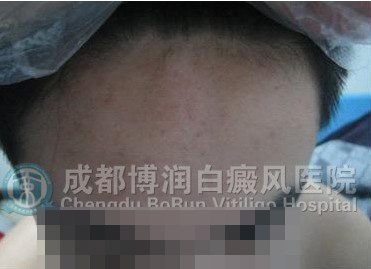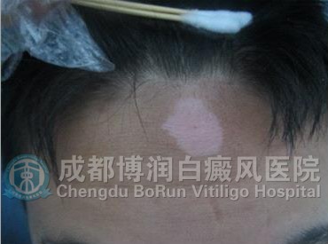 (3月1日,初诊时,患者额头处白斑明显,边缘清晰,处于进展期)