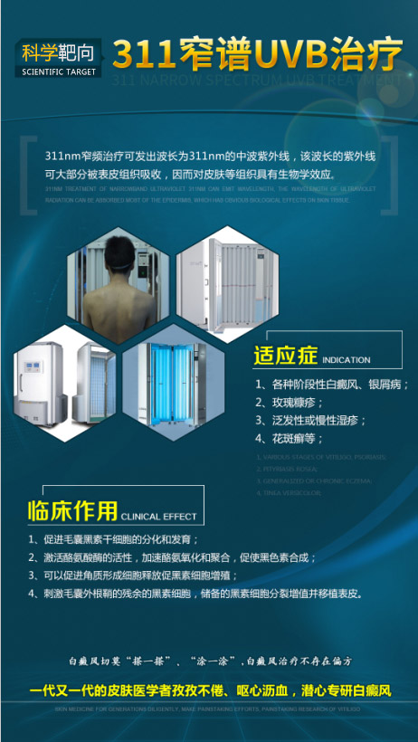 311nm窄谱UVB治疗可发出波长为311nm的中波紫外线,该波长的紫外线可大部分被表皮组织吸收,因而对皮肤等组织具有一定的生物学效应。