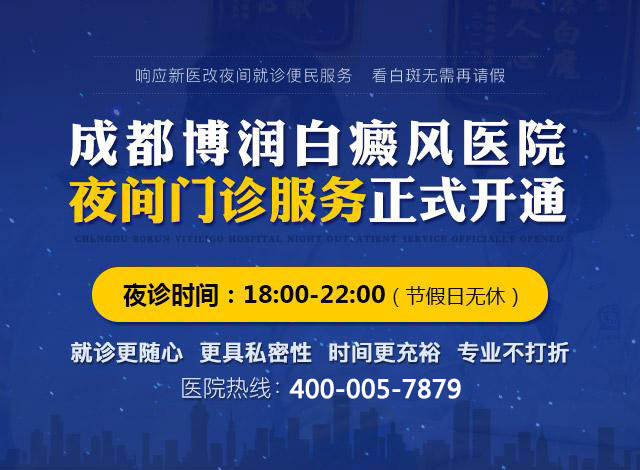夏季白昼变长,夜间门诊,是成都博润根据当前患者数量、就诊需求及医院整体情况而开设。夏季白癜风高频率被诱发,很多患者身患白斑,却没有足够时间来治疗,甚至出现断诊情况,十分不利于康复。