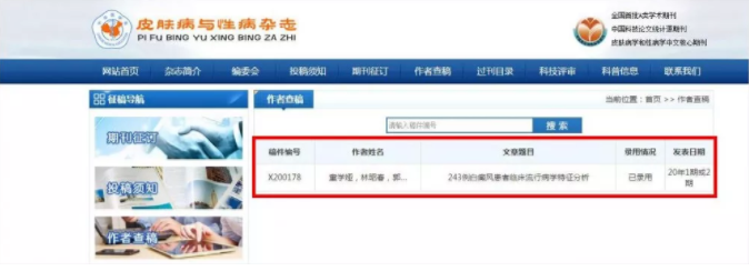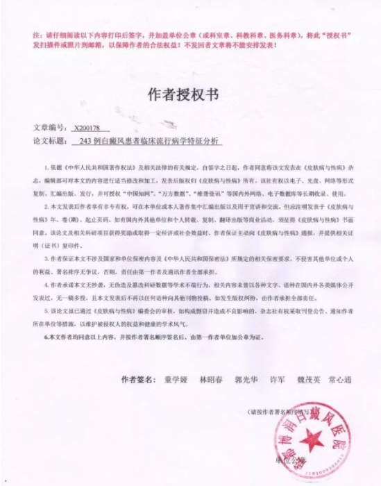 2019年8月5日,我院童学娅,林昭春,郭光华等医生向《皮肤病与性病》杂志投稿的稿件——《243 例白癜风患者临床流行病学特征分析》(稿件编号:X200178 )经该刊编委会综合评议,符合发表要求,该刊决定予以采用。